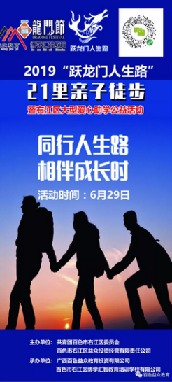 2019年百色市首屆龍門節(jié)暨右江區(qū)大型愛心助學(xué)公益活動第三場—“躍龍門人生路”親子徒步活動將于6月29日舉行,徒步全程10.5公里?;顒幽康氖菫榱烁玫貍鞑ァ凹彝?傳承+親子”的價(jià)值理念,以徒步的形式延伸出孩子成長路上的每個(gè)階段,徒步的背后蘊(yùn)含著一個(gè)永不言棄的家庭奮斗精神?;顒訄?bào)名費(fèi)用50元/家庭(含2家長+1孩子或者1家長+2孩子),所有報(bào)名費(fèi)用由共青團(tuán)百色市右江區(qū)委員會捐贈給右江區(qū)建檔立卡的貧困家庭學(xué)生。報(bào)名參與長按海報(bào)上二維碼識別繳費(fèi)即可,歡迎廣大學(xué)生家長踴躍參與。