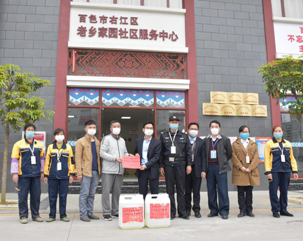 右江區(qū)總工會領(lǐng)導(dǎo)向老鄉(xiāng)家園-迎龍安置小鎮(zhèn)服務(wù)企業(yè)益眾物業(yè)公司捐贈防疫物資