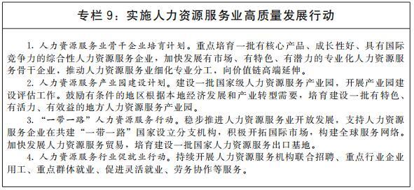 加快人力資源服務(wù)業(yè)高質(zhì)量發(fā)展。推動(dòng)人力資源服務(wù)與實(shí)體經(jīng)濟(jì)融合發(fā)展,引導(dǎo)人力資源服務(wù)機(jī)構(gòu)圍繞產(chǎn)業(yè)基礎(chǔ)高級(jí)化、產(chǎn)業(yè)鏈現(xiàn)代化提供精準(zhǔn)專業(yè)服務(wù)。鼓勵(lì)人力資源服務(wù)業(yè)管理創(chuàng)新、技術(shù)創(chuàng)新、服務(wù)創(chuàng)新和產(chǎn)品創(chuàng)新,大力發(fā)展人力資源管理咨詢、高級(jí)人才尋訪、人才測(cè)評(píng)等高技術(shù)、高附加值業(yè)態(tài)。實(shí)施人力資源服務(wù)業(yè)領(lǐng)軍人才培養(yǎng)計(jì)劃。開展“互聯(lián)網(wǎng)+人力資源服務(wù)”行動(dòng)。深化人力資源服務(wù)領(lǐng)域?qū)ν忾_放,探索建設(shè)國家人力資源服務(wù)出口基地。