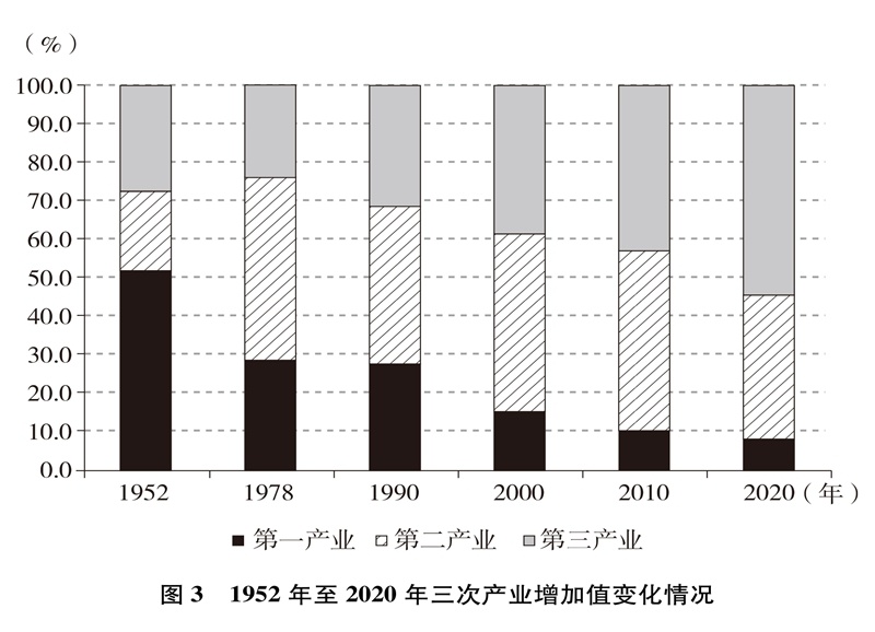 產(chǎn)業(yè)結(jié)構(gòu)優(yōu)化升級(jí)。中國(guó)已建成世界上最完整的產(chǎn)業(yè)體系,產(chǎn)業(yè)發(fā)展持續(xù)向中高端邁進(jìn)。三次產(chǎn)業(yè)增加值之比從1952年的50.5∶20.8∶28.7到2020年的7.7∶37.8∶54.5,中國(guó)從傳統(tǒng)農(nóng)業(yè)大國(guó)成為工業(yè)大國(guó)、服務(wù)業(yè)大國(guó)(圖3),中國(guó)經(jīng)濟(jì)從依賴單一產(chǎn)業(yè)為主轉(zhuǎn)向依靠三次產(chǎn)業(yè)共同帶動(dòng)。農(nóng)業(yè)現(xiàn)代化成效顯著,機(jī)械化、數(shù)字化、綠色化、功能化、共享化水平明顯提高,廣大農(nóng)民逐步告別“面朝黃土背朝天、一身力氣百身汗”的辛勞,農(nóng)村生產(chǎn)力極大解放;糧食生產(chǎn)能力穩(wěn)步提升,實(shí)現(xiàn)谷物基本自給,中國(guó)人把飯碗牢牢端在自己手中。中國(guó)建成門(mén)類齊全、獨(dú)立完整的現(xiàn)代工業(yè)體系,工業(yè)化和信息化融合發(fā)展的廣度和深度不斷拓展,“中國(guó)制造”向“中國(guó)智造”轉(zhuǎn)型升級(jí),產(chǎn)業(yè)鏈供應(yīng)鏈現(xiàn)代化水平進(jìn)一步提升。以新一代信息技術(shù)、生物技術(shù)、高端裝備、綠色環(huán)保為代表的戰(zhàn)略性新興產(chǎn)業(yè)發(fā)展迅速,成為引領(lǐng)高質(zhì)量發(fā)展的重要引擎。數(shù)字經(jīng)濟(jì)激發(fā)經(jīng)濟(jì)發(fā)展新活力,產(chǎn)業(yè)數(shù)字化和數(shù)字產(chǎn)業(yè)化趨勢(shì)加快?,F(xiàn)代服務(wù)業(yè)加速發(fā)展,以“互聯(lián)網(wǎng)+”為標(biāo)志的新業(yè)態(tài)、新模式層出不窮,平臺(tái)經(jīng)濟(jì)、共享經(jīng)濟(jì)蓬勃興起,生產(chǎn)性服務(wù)業(yè)向?qū)I(yè)化和高端化發(fā)展,生活性服務(wù)業(yè)向精細(xì)化和高品質(zhì)轉(zhuǎn)變。產(chǎn)業(yè)結(jié)構(gòu)的優(yōu)化升級(jí)促進(jìn)了經(jīng)濟(jì)更加均衡、更加充分的發(fā)展,人們個(gè)性化品質(zhì)化多樣化需求不斷得到滿足。