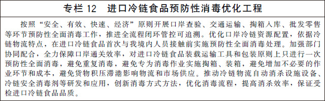 健全檢驗(yàn)檢測(cè)檢疫體系。適應(yīng)不同農(nóng)產(chǎn)品檢驗(yàn)檢測(cè)檢疫要求,完善覆蓋從種養(yǎng)殖、加工到銷售終端全鏈條以及冷鏈物流包裝、運(yùn)載工具、作業(yè)環(huán)境等全要素的檢驗(yàn)檢測(cè)檢疫體系。加強(qiáng)檢驗(yàn)檢測(cè)檢疫設(shè)施建設(shè)和設(shè)備配置,完善應(yīng)急檢驗(yàn)檢測(cè)檢疫預(yù)案,實(shí)行閉環(huán)式疫情防控管理,防范非洲豬瘟、新冠肺炎、禽流感等疫情擴(kuò)散風(fēng)險(xiǎn),提高重大公共衛(wèi)生事件等應(yīng)急處置能力。