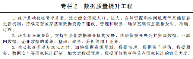 (一)強(qiáng)化高質(zhì)量數(shù)據(jù)要素供給。支持市場主體依法合規(guī)開展數(shù)據(jù)采集,聚焦數(shù)據(jù)的標(biāo)注、清洗、脫敏、脫密、聚合、分析等環(huán)節(jié),提升數(shù)據(jù)資源處理能力,培育壯大數(shù)據(jù)服務(wù)產(chǎn)業(yè)。推動(dòng)數(shù)據(jù)資源標(biāo)準(zhǔn)體系建設(shè),提升數(shù)據(jù)管理水平和數(shù)據(jù)質(zhì)量,探索面向業(yè)務(wù)應(yīng)用的共享、交換、協(xié)作和開放。加快推動(dòng)各領(lǐng)域通信協(xié)議兼容統(tǒng)一,打破技術(shù)和協(xié)議壁壘,努力實(shí)現(xiàn)互通互操作,形成完整貫通的數(shù)據(jù)鏈。推動(dòng)數(shù)據(jù)分類分級管理,強(qiáng)化數(shù)據(jù)安全風(fēng)險(xiǎn)評估、監(jiān)測預(yù)警和應(yīng)急處置。深化政務(wù)數(shù)據(jù)跨層級、跨地域、跨部門有序共享。建立健全國家公共數(shù)據(jù)資源體系,統(tǒng)籌公共數(shù)據(jù)資源開發(fā)利用,推動(dòng)基礎(chǔ)公共數(shù)據(jù)安全有序開放,構(gòu)建統(tǒng)一的國家公共數(shù)據(jù)開放平臺(tái)和開發(fā)利用端口,提升公共數(shù)據(jù)開放水平,釋放數(shù)據(jù)紅利。