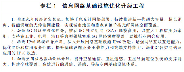 (一)加快建設(shè)信息網(wǎng)絡(luò)基礎(chǔ)設(shè)施。建設(shè)高速泛在、天地一體、云網(wǎng)融合、智能敏捷、綠色低碳、安全可控的智能化綜合性數(shù)字信息基礎(chǔ)設(shè)施。有序推進(jìn)骨干網(wǎng)擴(kuò)容,協(xié)同推進(jìn)千兆光纖網(wǎng)絡(luò)和5G網(wǎng)絡(luò)基礎(chǔ)設(shè)施建設(shè),推動(dòng)5G商用部署和規(guī)模應(yīng)用,前瞻布局第六代移動(dòng)通信(6G)網(wǎng)絡(luò)技術(shù)儲(chǔ)備,加大6G技術(shù)研發(fā)支持力度,積極參與推動(dòng)6G國際標(biāo)準(zhǔn)化工作。積極穩(wěn)妥推進(jìn)空間信息基礎(chǔ)設(shè)施演進(jìn)升級,加快布局衛(wèi)星通信網(wǎng)絡(luò)等,推動(dòng)衛(wèi)星互聯(lián)網(wǎng)建設(shè)。提高物聯(lián)網(wǎng)在工業(yè)制造、農(nóng)業(yè)生產(chǎn)、公共服務(wù)、應(yīng)急管理等領(lǐng)域的覆蓋水平,增強(qiáng)固移融合、寬窄結(jié)合的物聯(lián)接入能力。