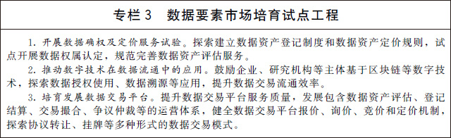 (二)加快數(shù)據(jù)要素市場化流通。加快構(gòu)建數(shù)據(jù)要素市場規(guī)則,培育市場主體、完善治理體系,促進(jìn)數(shù)據(jù)要素市場流通。鼓勵(lì)市場主體探索數(shù)據(jù)資產(chǎn)定價(jià)機(jī)制,推動(dòng)形成數(shù)據(jù)資產(chǎn)目錄,逐步完善數(shù)據(jù)定價(jià)體系。規(guī)范數(shù)據(jù)交易管理,培育規(guī)范的數(shù)據(jù)交易平臺(tái)和市場主體,建立健全數(shù)據(jù)資產(chǎn)評估、登記結(jié)算、交易撮合、爭議仲裁等市場運(yùn)營體系,提升數(shù)據(jù)交易效率。嚴(yán)厲打擊數(shù)據(jù)黑市交易,營造安全有序的市場環(huán)境。
