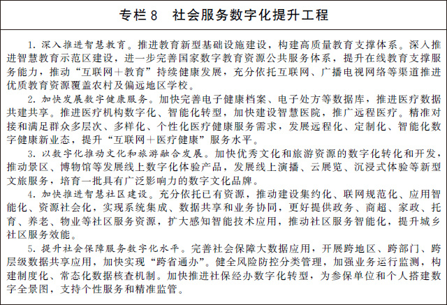 (二)提升社會(huì)服務(wù)數(shù)字化普惠水平。加快推動(dòng)文化教育、醫(yī)療健康、會(huì)展旅游、體育健身等領(lǐng)域公共服務(wù)資源數(shù)字化供給和網(wǎng)絡(luò)化服務(wù),促進(jìn)優(yōu)質(zhì)資源共享復(fù)用。充分運(yùn)用新型數(shù)字技術(shù),強(qiáng)化就業(yè)、養(yǎng)老、兒童福利、托育、家政等民生領(lǐng)域供需對接,進(jìn)一步優(yōu)化資源配置。發(fā)展智慧廣電網(wǎng)絡(luò),加快推進(jìn)全國有線電視網(wǎng)絡(luò)整合和升級改造。深入開展電信普遍服務(wù)試點(diǎn),提升農(nóng)村及偏遠(yuǎn)地區(qū)網(wǎng)絡(luò)覆蓋水平。加強(qiáng)面向革命老區(qū)、民族地區(qū)、邊疆地區(qū)、脫貧地區(qū)的遠(yuǎn)程服務(wù),拓展教育、醫(yī)療、社保、對口幫扶等服務(wù)內(nèi)容,助力基本公共服務(wù)均等化。加強(qiáng)信息無障礙建設(shè),提升面向特殊群體的數(shù)字化社會(huì)服務(wù)能力。促進(jìn)社會(huì)服務(wù)和數(shù)字平臺(tái)深度融合,探索多領(lǐng)域跨界合作,推動(dòng)醫(yī)養(yǎng)結(jié)合、文教結(jié)合、體醫(yī)結(jié)合、文旅融合。