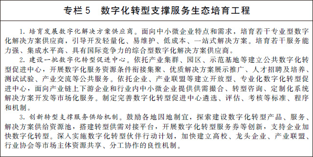 (四)培育轉(zhuǎn)型支撐服務(wù)生態(tài)。建立市場化服務(wù)與公共服務(wù)雙輪驅(qū)動(dòng),技術(shù)、資本、人才、數(shù)據(jù)等多要素支撐的數(shù)字化轉(zhuǎn)型服務(wù)生態(tài),解決企業(yè)“不會(huì)轉(zhuǎn)”“不能轉(zhuǎn)”“不敢轉(zhuǎn)”的難題。面向重點(diǎn)行業(yè)和企業(yè)轉(zhuǎn)型需求,培育推廣一批數(shù)字化解決方案。聚焦轉(zhuǎn)型咨詢、標(biāo)準(zhǔn)制定、測試評估等方向,培育一批第三方專業(yè)化服務(wù)機(jī)構(gòu),提升數(shù)字化轉(zhuǎn)型服務(wù)市場規(guī)模和活力。支持高校、龍頭企業(yè)、行業(yè)協(xié)會(huì)等加強(qiáng)協(xié)同,建設(shè)綜合測試驗(yàn)證環(huán)境,加強(qiáng)產(chǎn)業(yè)共性解決方案供給。建設(shè)數(shù)字化轉(zhuǎn)型促進(jìn)中心,銜接集聚各類資源條件,提供數(shù)字化轉(zhuǎn)型公共服務(wù),打造區(qū)域產(chǎn)業(yè)數(shù)字化創(chuàng)新綜合體,帶動(dòng)傳統(tǒng)產(chǎn)業(yè)數(shù)字化轉(zhuǎn)型。