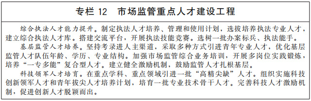 加強人才隊伍建設。健全人才引進、培養(yǎng)、使用、評價、激勵機制,統(tǒng)籌推進市場監(jiān)管人才隊伍建設。加快高水平市場監(jiān)管智庫和綜合型研究機構建設,加強重大理論和實踐問題戰(zhàn)略研究、決策咨詢,開展人才需求分析。推進市場監(jiān)管人才培養(yǎng),加快相關學科專業(yè)建設,培養(yǎng)符合市場監(jiān)管現(xiàn)代化需求的后備人才。在檢驗檢測、藥品審評、檢查核查、網(wǎng)絡數(shù)據(jù)監(jiān)管、知識產(chǎn)權、質量技術等重點專業(yè)領域,著力培養(yǎng)引進一批“高精尖缺”人才。組織開展綜合執(zhí)法大練兵,提升基層人才隊伍能力水平。加強市場監(jiān)管文化建設,增進價值認同、情感認同、文化認同,增強做好市場監(jiān)管工作的責任感和使命感。