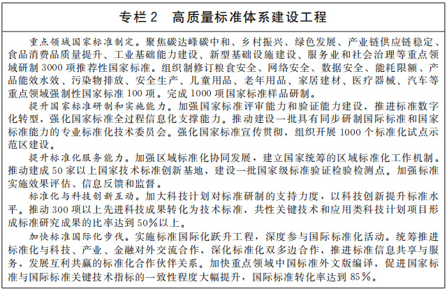 深化標準化改革創(chuàng)新。加快標準供給由政府主導向政府與市場并重轉變,標準運用由產(chǎn)業(yè)與貿易為主向經(jīng)濟社會全域轉變,標準化工作由國內驅動向國內國際相互促進轉變,標準化發(fā)展由數(shù)量規(guī)模型向質量效益型轉變。持續(xù)優(yōu)化政府頒布標準與市場自主制定標準協(xié)調配合的新型標準體系,推動一般性產(chǎn)品、服務標準由市場自主制定,建立健全政府頒布標準采信市場自主制定標準的機制。建立法規(guī)引用標準制度,強化法規(guī)與標準有效協(xié)調機制,運用標準支撐法規(guī)落地實施。加強標準化技術組織建設,提升國家標準研制和實施能力。加強國家技術標準創(chuàng)新基地和國家級標準驗證檢驗檢測點建設,提升標準化技術支撐水平。實施標準全生命周期閉環(huán)管理,完善標準實施信息反饋與評估制度,建立國家標準動態(tài)維護機制。開展對標達標專項行動,推動團體標準培優(yōu)計劃和企業(yè)標準領跑者制度實施,消除標準制定團體培育發(fā)展的政策障礙,釋放企業(yè)、社會團體標準化活力。