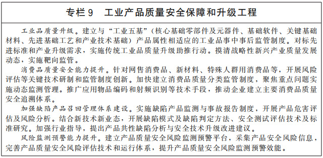 加大消費品安全監(jiān)管力度。推動企業(yè)建立主要消費品質量安全追溯體系,記錄重點環(huán)節(jié)過程信息,實現(xiàn)產(chǎn)品質量安全問題可追溯。健全缺陷產(chǎn)品召回制度,加強大中型客貨車、新能源汽車與智能網(wǎng)聯(lián)汽車、智能家居、兒童用品、電子電器等重點產(chǎn)品召回管理,強化重大案件調查與召回后續(xù)監(jiān)督工作,完善缺陷產(chǎn)品召回技術支撐體系。完善產(chǎn)品傷害監(jiān)測制度,拓寬監(jiān)測信息采集渠道,增加監(jiān)測點,推進產(chǎn)品傷害預防干預。完善產(chǎn)品質量安全事故強制報告和調查處理制度,提高質量安全事故人身傷害賠償標準。