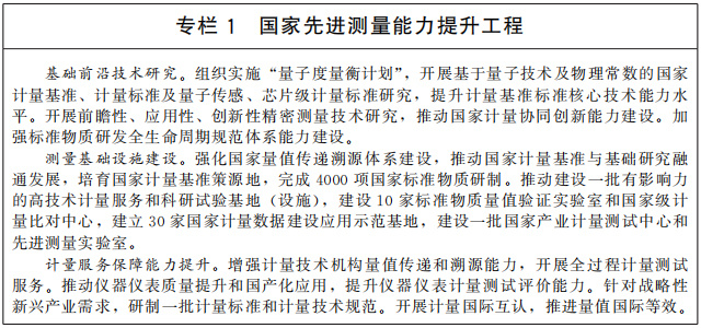 構建現(xiàn)代先進測量體系。加強以量子計量為核心的先進測量體系建設,加快建立新一代國家計量基準,推進社會公用計量標準升級換代,制定一批關系國計民生的重要計量技術規(guī)范。改革完善計量器具型式批準、檢定、法制監(jiān)督等管理制度,對強制管理的計量器具目錄實施動態(tài)調整,完善商品量、計量數(shù)據(jù)等量值監(jiān)管制度。深入推進計量技術機構改革創(chuàng)新發(fā)展,探索計量校準市場和校準機構建設的有效途徑,規(guī)范計量校準市場,滿足市場對量值溯源和測試服務的需求。建立國家計量數(shù)據(jù)建設應用示范基地,提升國家產(chǎn)業(yè)計量測試和能源計量能力。積極參與國際計量比對,提升國際承認的校準與測量能力。