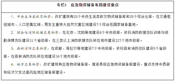 充分利用倉儲資源,依托現(xiàn)有中央和地方物資儲備庫,建設(shè)綜合應(yīng)急物資儲備庫。在交通樞紐城市、人口密集區(qū)域、易發(fā)生重特大自然災(zāi)害區(qū)域建設(shè)一批綜合性國家儲備基地。建設(shè)完善國家綜合性消防救援隊伍應(yīng)急物資儲備庫及戰(zhàn)勤保障站。在關(guān)鍵物流樞紐建設(shè)應(yīng)急物資調(diào)運平臺和區(qū)域配送中心,依托大型快遞物流企業(yè)建設(shè)一批綜合應(yīng)急物資物流基地。完善國家應(yīng)急資源管理平臺和應(yīng)急物資保障數(shù)據(jù)庫,匯聚應(yīng)急物資信息。